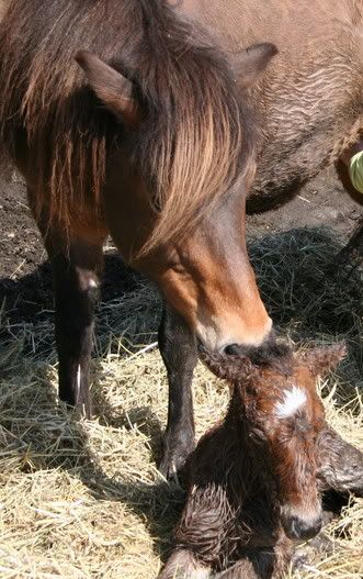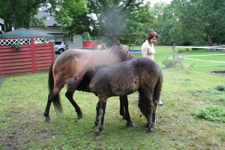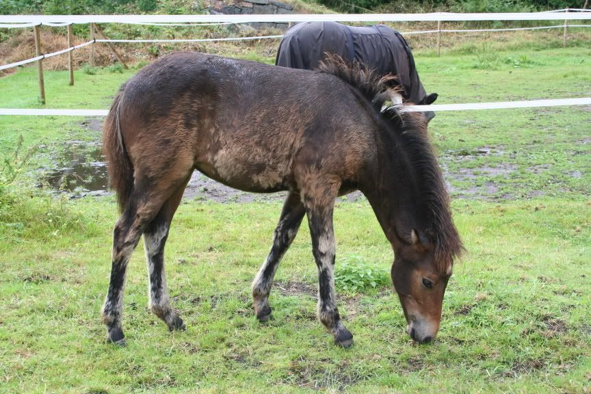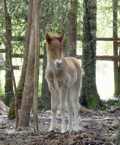 Og her er overaskelses-føllet på stallen. Ingen viste at hoppen skulle ha føll, før vi fant ut at den store magen kan umulig være gressmage! Tre uker etter kom et lite hoppeføll fallende ut... =) Moren er Kaldblod og faren er Connemara. Det må være han som er faren, selv om han var bare åring i fjor... Noe annet skjønner vi ikke.... Vi skjønner egentlig ingenting....