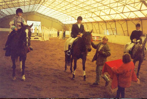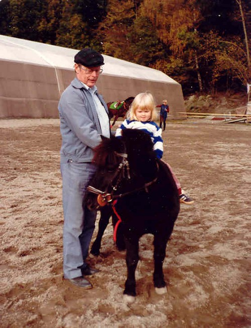 jeg har dessverre ikke bilde av mitt første møte med hest, men jeg har sett det... men her er bestefar, Bonzo og meg på ridesenteret på heistad!! tanta mi i bakgrunnen!!