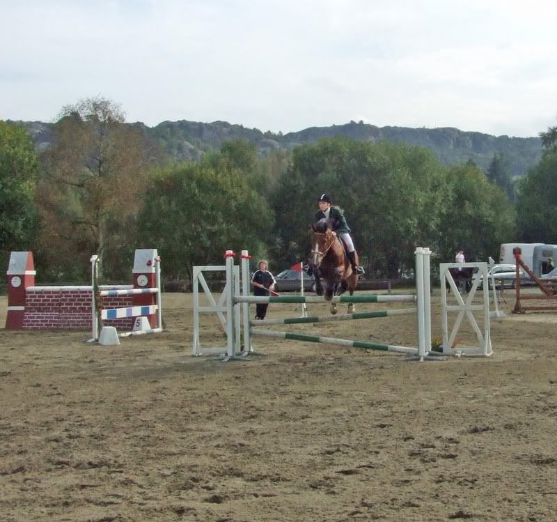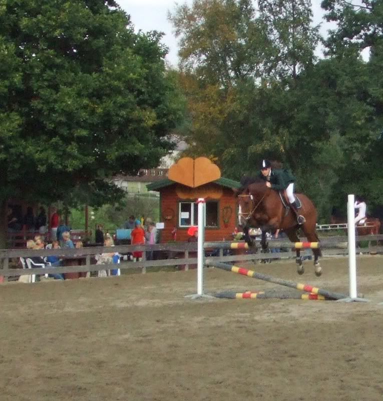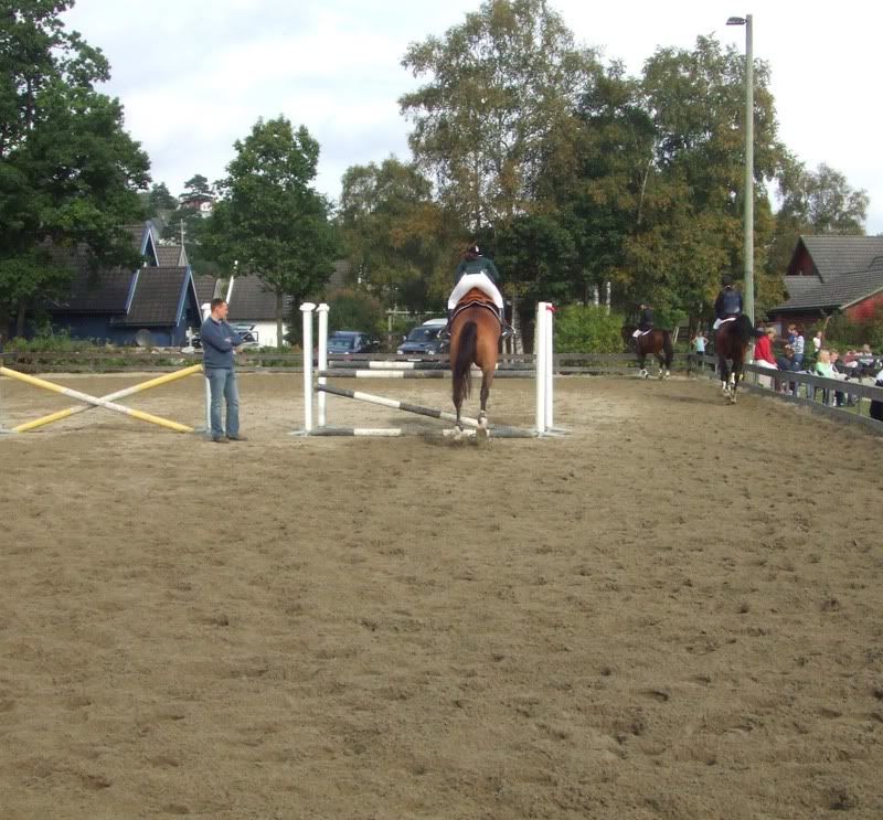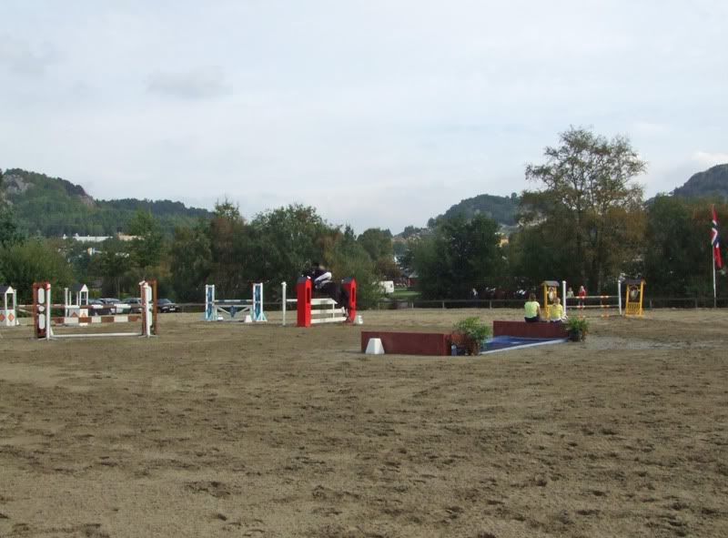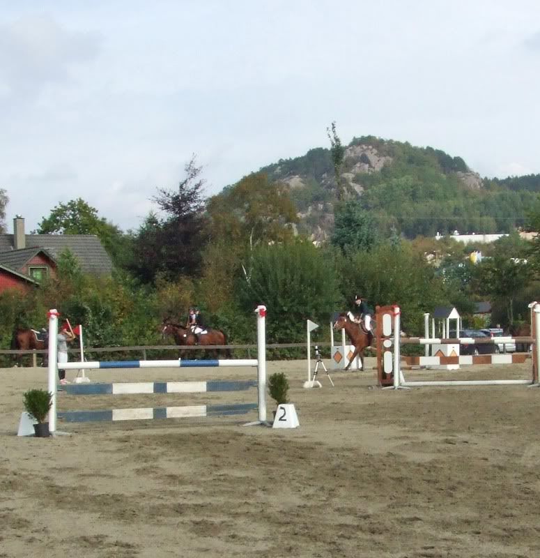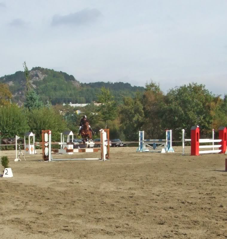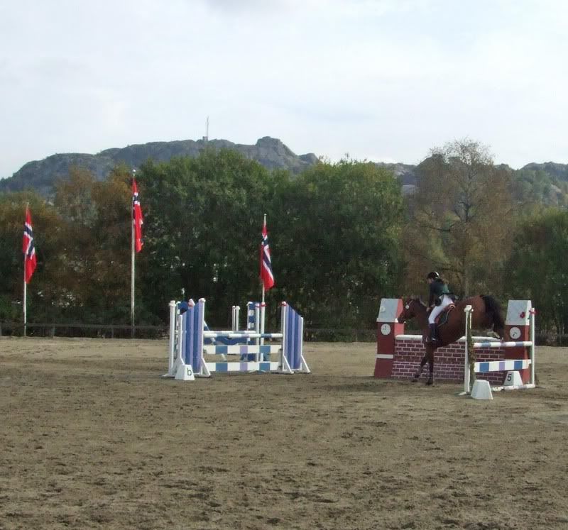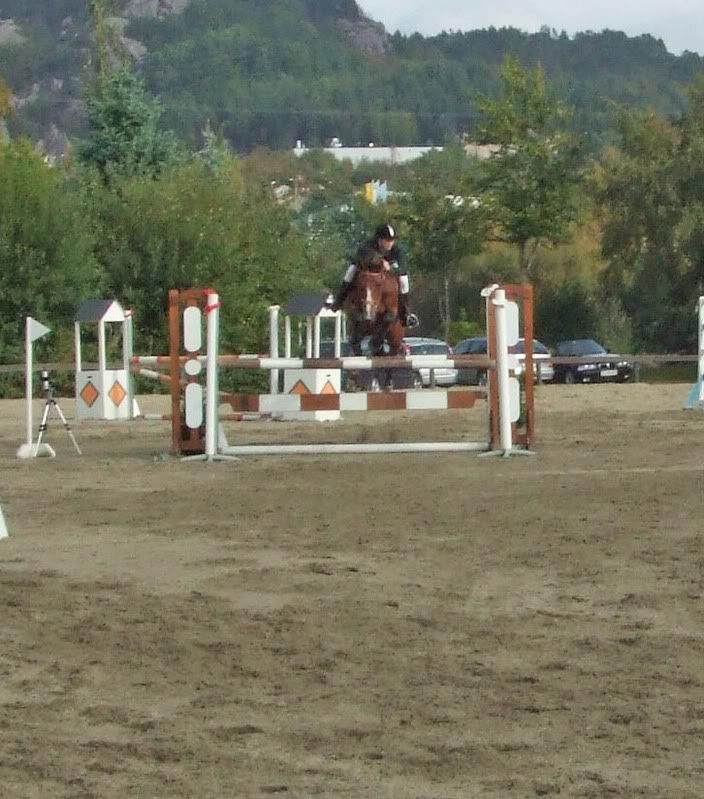 Fikk ikke plasseringer nei, men er fornøyd for det, for Cheri gikk ganske bra (dro litt og ble litt sterk da, hehe, sitter der og piiiiholder på henne:p) Tok med oss en bom i 1m, men hadde best tid av de med 4 feil da:) Ogg fikk et stopp i komb.-en i 110 som var kun min feil. Stressa med og holde henne etter muren og holdt så mye igjen at jeg, ikke hesten, stoppet forann hinderet (oppdaget først at det var min feil da jeg så videoen etterpå:p)