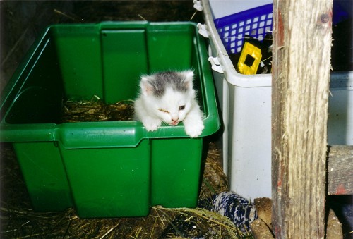 Året etter skulle ho ha kattungar, men dessverre var dette på vinteren og ho fødde dei ute under hønsehuset (tidligare leikehytta vår).