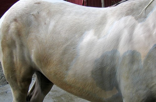 Den mørke huden vil etterhvert bli dekket av hvitt, og dermed vil hesten bli buckskin/hvit og ikke tricolor som den er nå..