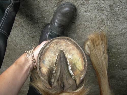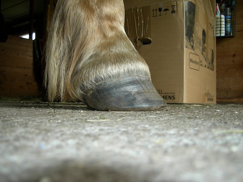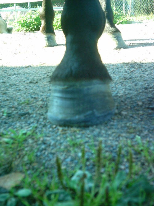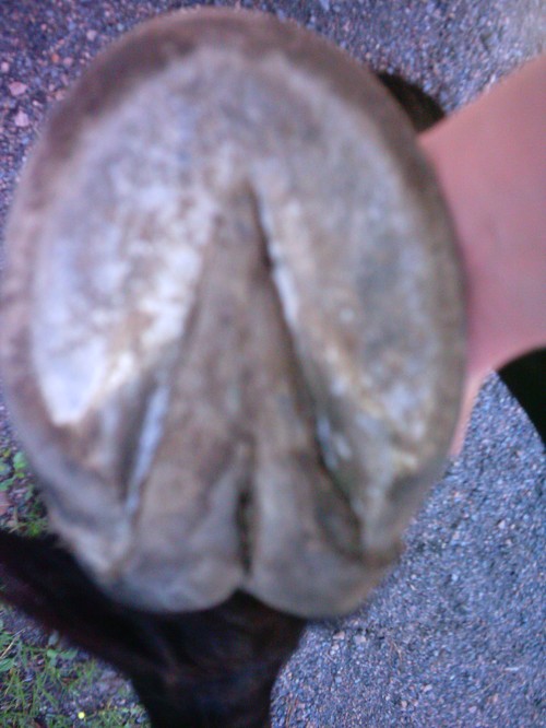 Hoven på bildet kommer sikkert til å forrandre seg en god del ennå, og bli rundere og bredere. Ser ut som det er en liten sprekk i midtstrålefuren. Vanskelig å se, men hvis det er litt "guggent" der inne så er det lurt å putte nedi noe desinfiserende Strålene er ganske smale ennå, men hele hælpartiet kommer nok til å utvide seg etterhvert. Å holde strålen i orden er viktig, for en infisert stråle er vond å tråkke ned på, og dermed ungår hesten å legge så mye tyngde bak på hoven. Lave hæler/drakthvørner er viktig, men hvis det å holde de så lave som man ønsker fører til at hesten blir mer sårbeint, må man vurdere å la de være litt høyere enn hva man egentlig ønsker. Vanskelig å se ut i fra bildene, men fra undersiden ser de hvertfall passe høye ut. Men er innsiden bittelitt høyere enn utsiden, eller er det bare bildet som lyver eller øynene mine som tøyser?
