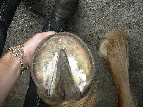 Han skulle stoppe en nedovervoksende sprekk og hans GENIALE løsning på det var å file over hoven helt inn til lærhuden!!! Skal legge ut bilde av den andre hoven også som ikke er vokst ned enda... på denne er merket straks borte.