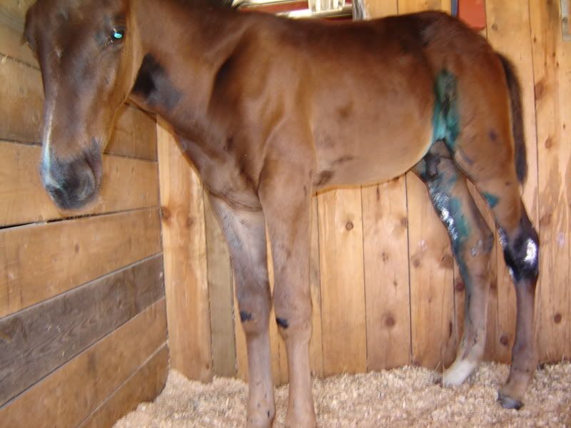 Først ble han sparket kraftig av hoppa rett etter fødselen, hadde i tillegg føllsyke så haseleddet ble gjennomspylt. Og SÅ greide han å falle ned fra et lite fjell og landet OPPÅ gjærdet som var nedenfor.. Så det har vert mye sårstell denne sommeren ja