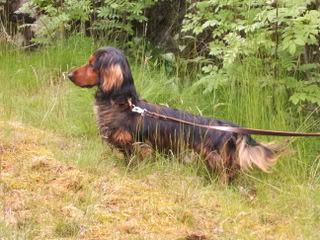 Jeg hadde han på forvertavtale i ett år, så ble han min. han har blitt utstillingschampion og viltsporchampion. Men han har levd et hardt liv, jeg er den fjerde familien han er hos. Han er en tøffing, men jeg har hatt dachs i alle mine 25 år - så jeg kjenner de! Han er bestevenn med katten vår, min søsters og min mors 3 katter :). Gentleman ovenfor tisper og valper, men hater hannbikkjer :). Han er glad i å være med i stallen og han har respekt for at hestene er store, holder seg derfor unna bein og slikt. Utrolig grei å masse herlig personlighet og sjarmerende stahet... Men har man ikke erfaring med dachs, burde man tenke seg nøye om - for de er ganske spesielle :)
