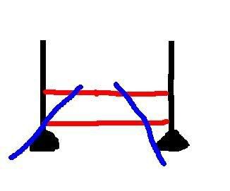 en ting som kan få hesten til å hoppe høyere over hinderet er å legge to bommer som en omvendt "V" på den øverste bommen. dvs at du legger en bom på skrå fra bakken foran hinderet og opp til den øverste, litt skrånende innover. og samme på andre siden. som dette (hanna er flink på paint hehe):