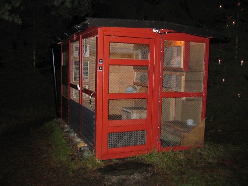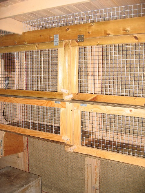 her er det litt tydligere. det er festet på noen lister som vi skrudde fast til veggen (på utsiden av nettingen bak burene).