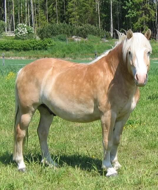 Han har ferie og brukes ikke i det hele tatt nå som han går på beitet. Det ville dessuten blitt vanskelig med tanke på avstanden til beitet han går på nå. Her hjemme brukes han kun som hobby hest, d.v.s. turridning, western, litt sprang men ikke noe hardt (max 1 time per dag). Han ble sluppet på sommerbeitet den 2 juni så han har jo gått der en stund nå. Når det gjeder det med at beitet blir magrere så er nok ikke dette tilfellet her, desverre. Han går sammen med 3 andre på et svært, svært området med masser av mat så det monner i lange baner. Og så fort det blir delvis nedbeitet blir dem flyttet videre til neste beitet av hun som eier stedet p.g.a at de andre hestene han går sammen med trenger kraftig beite (de har lett for å tape seg i motsettning til tassen min). På beitet har han tilsyn hele døgnet så derfor er vi der ikke så ofte. Bildet ble tatt for ca. 2 uker siden, så omkretsen hans har sikkert økt enda litt siden det. (På bildet nr. 2 ovenfor ser du hvordan han ser ut til daglig.)