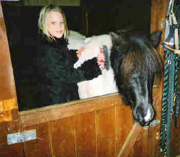 Hesten heter Laban, han er skolehest, veldig tung å ri og sur i stallen, men snill på bunnen :)