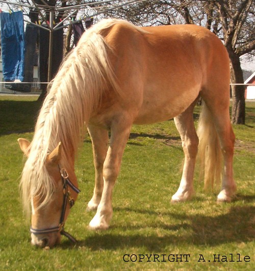 Ali, haflingervallak på 3 år. Står RØD i hestepasset hans...