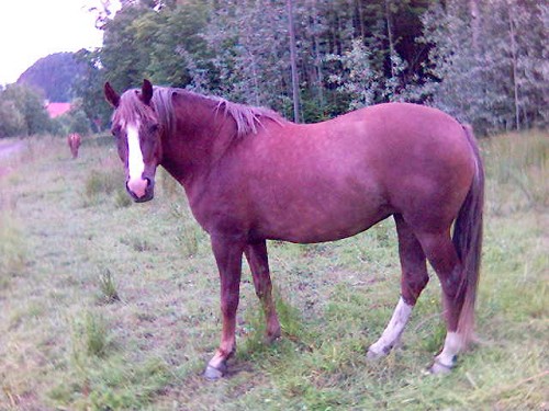 Thunder - blanding av varmblodstraver og araber. Skikkelig araberutseende i hodet og kroppen, lange traverbein. Han er ganske "jumpy", men veldig snill. Skal ri han for første gang idag, så vi får se hvordan det går=) Vakker i ordets rette forstand og jeg ser han så for meg på dressurbanen!! Han har en skavank av å være blanding da og det er at han ruller hodet rundt. DVS, han kaste hodet i været og vrir rundt på det...Ser ikke behagelig ut.