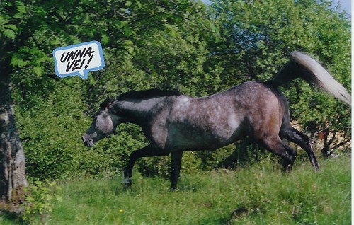 Kan til tider være noe flaut når han skal vise seg for andre når jeg rir ham da.. Hompe hompe for min del, der han "hoppetraver" avstes med hode og hale rett til værs, hehe. Da kan det være "noe vanskeligt" og holde seg i nærheten av salen ;o)