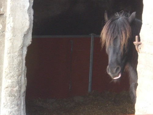 Det står en skummel hest utenfor, så hun er litt redd for å gå ut.